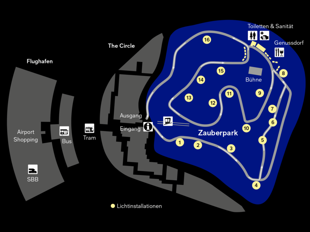 Der Zauberpark findet im Flughafenpark statt. Hier findest du eine Übersichtskarte. Die Lichtkunstinstallationen wie auch das Genussdorf sind nur mit einem gültigen Ticket zugänglich.